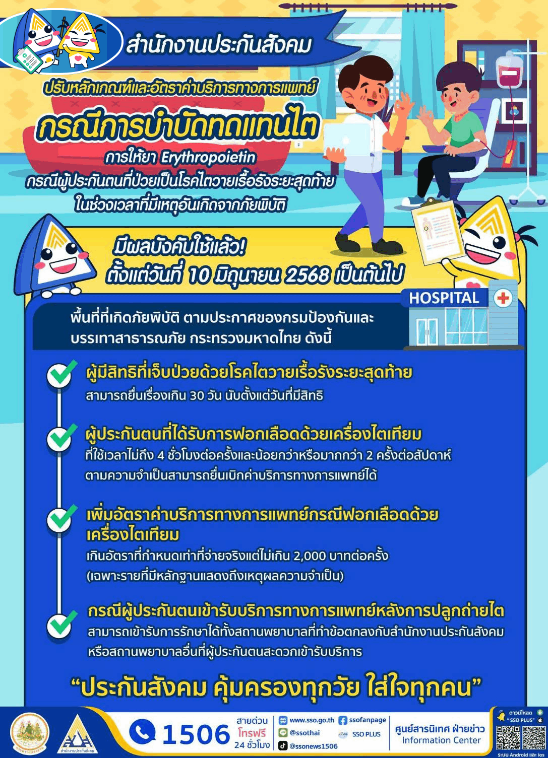 นางมารศรี กล่าวว่า ในส่วนของสำนักงานประกันสังคม ซึ่งมีภารกิจในการช่วยเหลือ หากเกิดกรณีเจ็บป่วยฉุกเฉินหรือบาดเจ็บ ผู้ประกันตนมีสิทธิเข้ารับการรักษาได้ที่โรงพยาบาลทุกแห่ง ภายใน 72 ชั่วโมง โดยไม่เสียค่าใช้จ่าย นอกจากนี้ เพื่อบรรเทาความเดือดร้อนแก่ผู้ประกันตนที่เจ็บป่วยด้วยโรคไตวายเรื้อรังระยะสุดท้าย รวมไปถึงจำเป็นต้องได้รับการบำบัดทดแทนไต รวมทั้งรับยา Erythropoietin เป็นประจำในสถานพยาบาลที่ตั้งอยู่ในพื้นที่ที่เกิดภัยพิบัติ สำนักงานประกันสังคมได้ออกประกาศคณะกรรมการการแพทย์ตามพระราชบัญญัติประกันสังคม เรื่องหลักเกณฑ์แล้วก็อัตราค่าบริการทางการแพทย์กรณีบำบัดทดแทนไต และก็การให้ยา Erythropoietin กรณีผู้ประกันตนที่เป็นโรคไตวายระยะสุดท้ายในช่วงเวลาที่มีเหตุอันเกิดจากภัยพิบัติ ตามประกาศของกรมป้องกันประกอบกับบรรเทาสาธารณภัย กระทรวงมหาดไทย ดังนี้