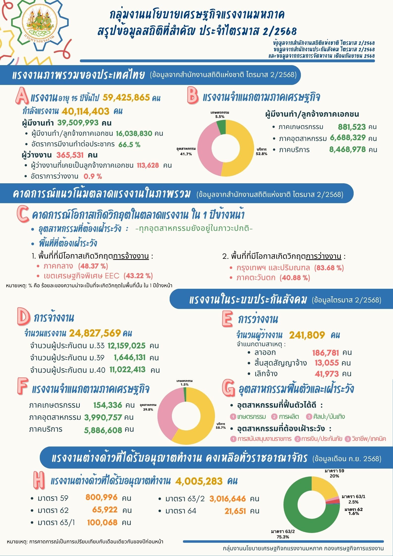 ขณะที่ข้อมูลแรงงานต่างด้าวที่ได้รับอนุญาตทำงานทั่วราชอาณาจักร ณ เดือนกันยายน 2568 มีจำนวน 4,005,283 คน แม้จะลดลงเล็กน้อยจากช่วงก่อนหน้า แต่เพิ่มขึ้นจากปีก่อนถึงร้อยละ 19.42 โดยส่วนใหญ่เป็นแรงงานที่ได้รับอนุญาตทำงานชั่วคราวตามมาตรา 63/2 ซึ่งอยู่ในระบบหมายรวมไปถึงผ่านการตรวจสอบอย่างถูกต้อง