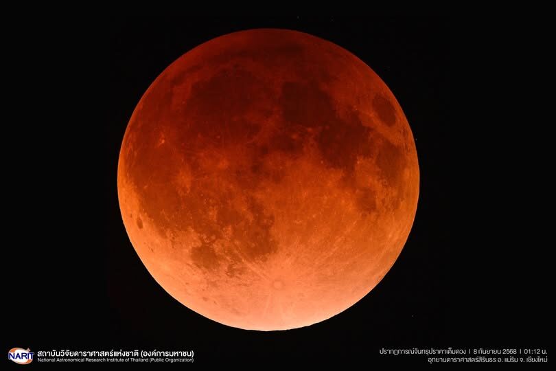 ภาพปรากฏการณ์จันทรุปราคาเต็มดวงเหนือฟ้าเมืองไทย ขณะเกิดคราสเต็มดวง ดวงจันทร์เต็มดวงปรากฏสีแดงอิฐ บันทึกภาพ ณ อุทยานดาราศาสตร์สิรินธร อ. แม่ริม จ. เชียงใหม่ ช่วงกึ่งกลางคราส เวลาประมาณ 01:12 น. ของวันที่ 8 กันยายน 2568 มีประชาชนชาวไทย ร่วมด้วยต่างประเทศให้ความสนใจ ติดตามชมถ่ายทอดสดปรากฏการณ์ผ่านทางเฟซบุ๊ก ร่วมกับยูทูบของ NARIT อย่างคึกคัก กว่าหมื่นคน