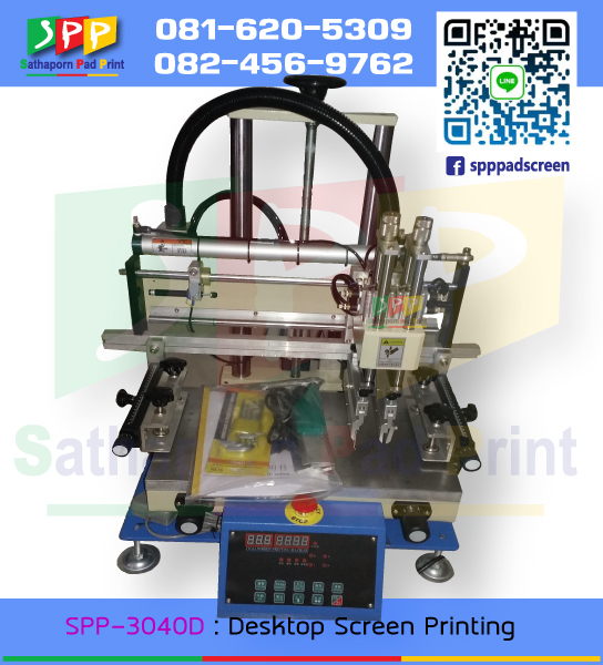 เครื่องสกรีนเสื้อ แบบตั้งโต๊ะ ฐานรองเป็นแบบพื้นเรียบ รุ่น SPP-3040D (Desktop Screen Printing) เป็นรุ่นเล็กสุดในกลุ่มเครื่องสกรีนพื้นเรียบ ใช้สำหรับการสกรีนวัสดุพื้นเรียบทั้งหลาย เสื้อ ถุงผ้า กล่อง ลัง เพื่องานสกรีนโลโก้ แบรนด์สินค้า ที่ชัดและต้องการคุณภาพ