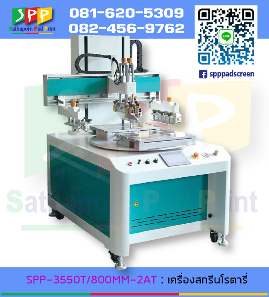 ข้อมูลจำเพาะของ เครื่องสกรีนโรตารี่ แบบอัตโนมัติ สำหรับใส่ชิ้นงาน 2 ด้าน รุ่น: SPP-3550T / 800MM-2AT สกรีนได้ สูงสุดของขนาดการพิมพ์ 300x450MM ฐานรองชิ้นงานเป็นแบบหมุน หัวสกรีนแม่นยำสูง ใช้ความเร็วในการพิมพ์ (ชิ้น / ชั่วโมง): 700 ~ 1,000 น้ำหนักเพียง 400 กก. ขับเคลื่อนด้วยระบบมอเตอร์หมุนเร็วทั้งขึ้นลง และซ้ายขวา ลื่นไหลงานไม่สะดุดแน่นอน